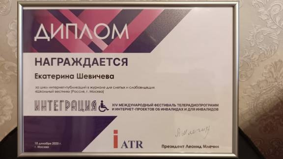 Екатерина Шевичева за цикл интернет-публикаций в журнале для слепых и слабовидящих "Школьный вестник" (Россия, г. Москва)